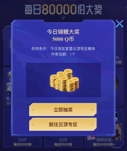 除此之外,本次活动每天还有一项“锦鲤大奖”:只要登录掌盟浏览云顶专区攻略就能参与抽奖。每日奖品不重复,包含5000Q币、1万现金、期限皮肤等。