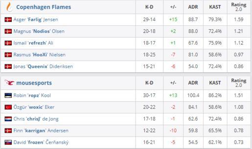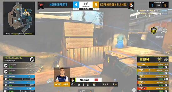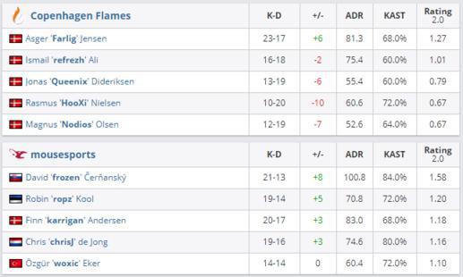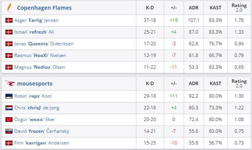 里约之路欧洲区B组,小组第四的Copenhagen Flames对阵小组第六的mousesports,图一死亡游乐园,Cph全员有着不错发挥,而Mouz这边ropz独木难支,Cph 16-13获胜。图二核子危机,双反战况十分焦灼,但Mouz最后更胜一筹,16-14赢下图二。图三列车停放站,双子星ropz和frozen带领Mouz一举击溃Cph,16-9轻松取得胜利。
