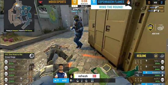 第二十二回合,refrezh击杀大仓的frozen,chrisJ见状直接前顶黄房完成三杀,refrezh和farlig没有时间只能保枪,比分9-13。第二十四回合Cph强起,封外场一线烟但并没有下K1,多人集合黄房提速,正面CT全员阵亡,ropz在铁板保枪也被包夹,比分11-13。