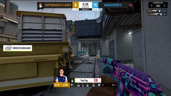 第二十六回合,farlig狙击前顶气球狙死两人,配合队友将Mouz全员击杀在前点,比分12-14。第二十八回合,Mouz一波B区快攻,下包后只剩下了farlig一人,但是farlig在油桶狙死woxic,再假拆狙死工地的frozen,极限拆包完成1V2,并帮助Cph拿到赛点。