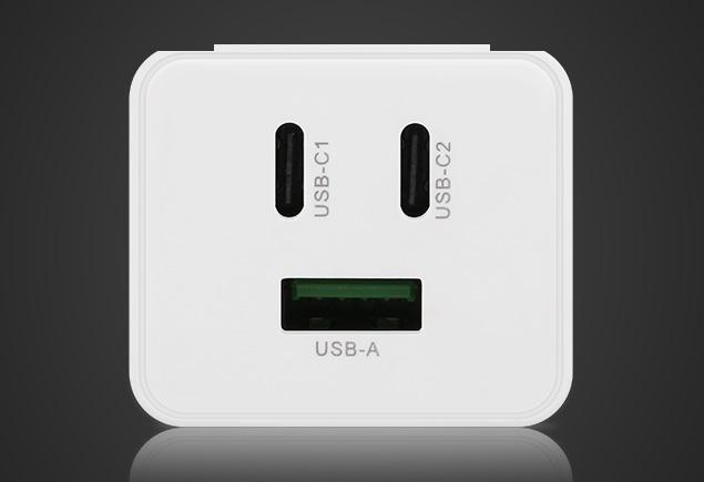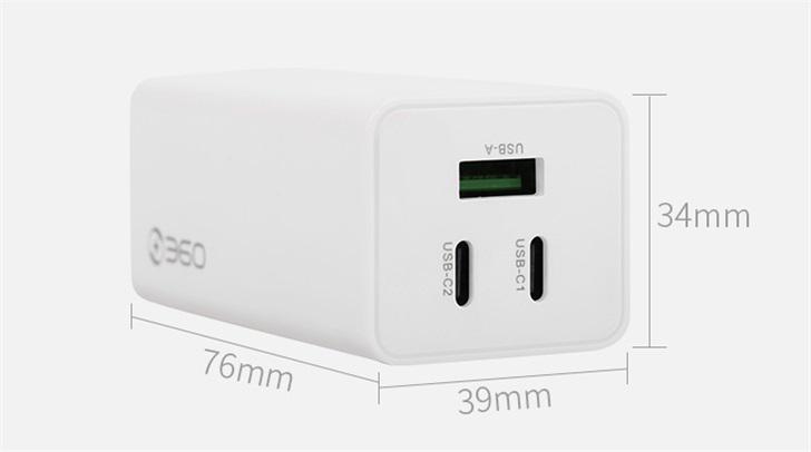 360 GaN氮化镓快充充电器支持三个USB快充,USB-C1单口输出65W,USB-C2单口输出30W,USB-A单口输出24W。
