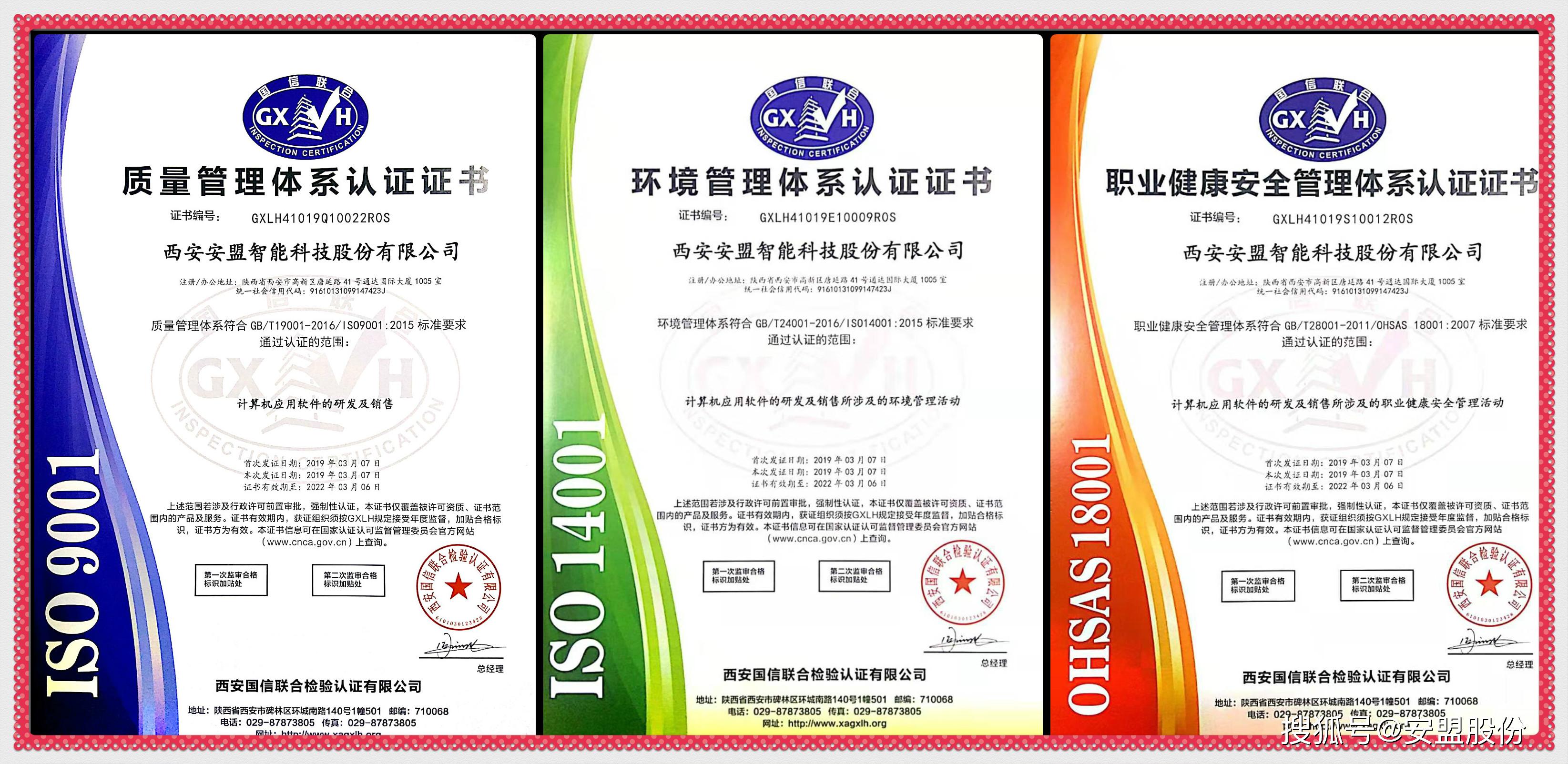 2019年3月,安盟科技获得质量ISO9001、环境ISO14001、职业健康OHSAS 18001管理体系证书;
