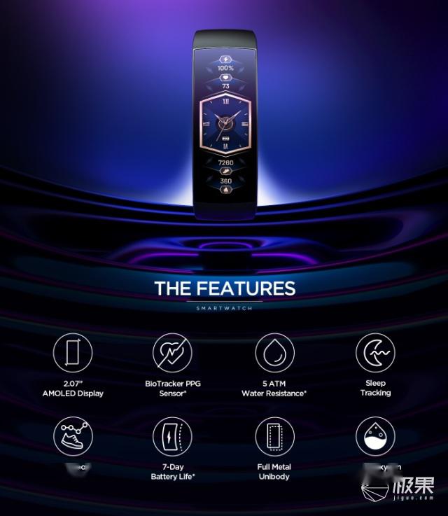 Amazfit X配备了一块2.07英寸的AMOLED显示曲面屏,屏幕的PPi为326ppi,最大可弯曲92°。同时,这款手表还配备了PPG(光电容脉搏)传感器以及24小时心率监测器,用于测量血氧浓度,充电一次可以使用长达7天。
