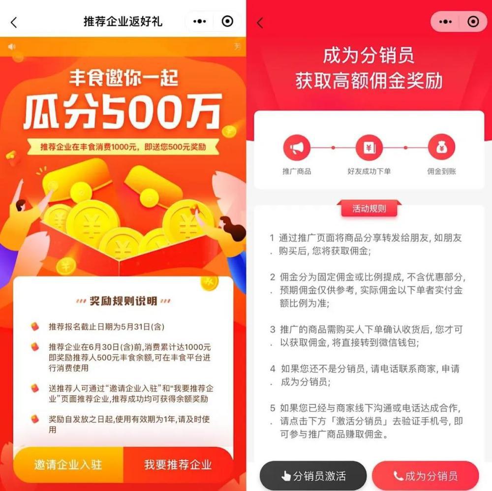 先抢商家,再抢用户,顺丰甚至玩起了“补贴价格战”的游戏。丰食推出了“瓜分500万”的活动,用户可通过“邀请企业入驻”和“我要推荐企业”页面推荐企业。奖励十分诱人——企业成功入驻后,推荐人将获取1元奖励。而推荐的企业6月30日前在丰食消费1000元,推荐人还可另外获得500元奖励。