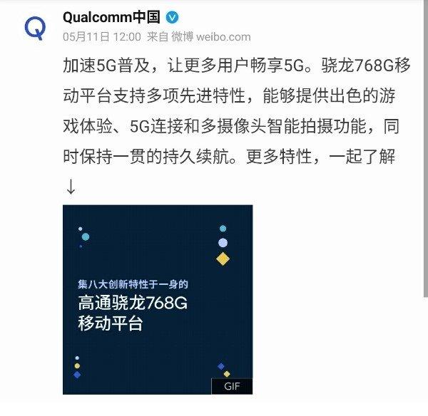 在就在今天,高通中国也是官方发布了全新的下一代中端5G SoC骁龙768G的消息,据悉,全新一代的骁龙768G采用了高通的Kyro 475的CPU和X52的基带加持,官方也是成为了加速5G普及以及让更多用户畅享5G。
