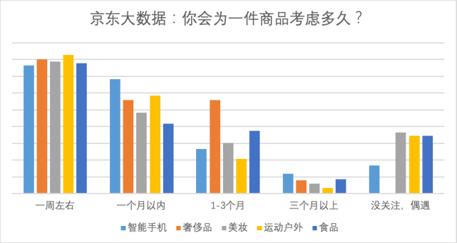 交叉对比这三类消费者购买的品类可以发现,购买某个新款奢侈品或食品的消费者没有出现关注超过3个月,但是关注1-3个月的占比较高;而新款美妆和运动户外(服饰或鞋靴)的购买者中“冲动性消费”(没关注,正好碰到了)的占比在几大品类中最高;购买手机的消费者,关注三个月以上的占比在各品类中最高,一周内就决定购买的人群占比最低。