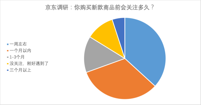 在针对购买过各类新品的消费者调研中,关注该新品“一周左右”的消费者约占37%,“关注一个月以内”33%——总计达到70%。这类人群对新品的功能、价格、外形、上市时间都有充分了解,往往在不同的选项间作过比较,最终在一个月内做出购买的决定,大致可以称为“合理价值驱动”型消费者;