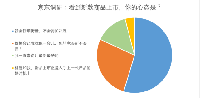 在针对购买过各类新品的消费者调研中,41%的消费者无论是否经过“犹豫期”,都会爽快地做出购买决定,不会马上决定的消费者占到55%,另有4%的人选择购买上一代产品。