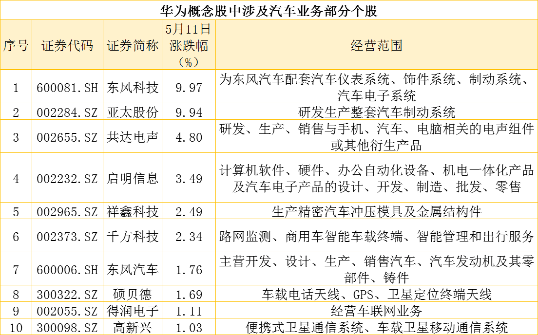 而由于市场对华为5G汽车的关注,“5G汽车生态圈”似乎给汽车行业带来了曙光,11日A股华为概念股中涉及汽车业务的个股,以及汽车零部件、无人驾驶等板块均有不错表现。