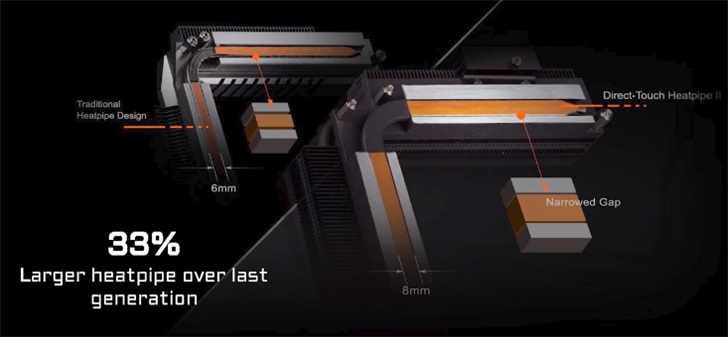 Direct Touch一代的导热管宽度为6mm,Direct Touch II的导热管升级到了8mm,通过这样的设计,热管和散热模组的接触会更紧密,从而提升整体的散热效率。