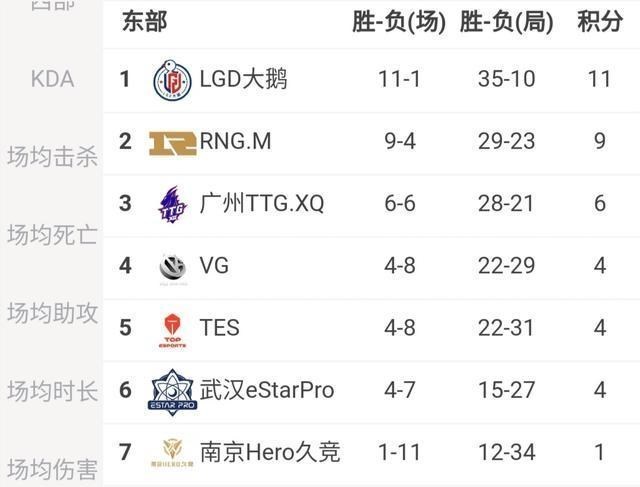 按照目前的战队排名来看,东部的前两名基本可以确定,分别是LED大鹅和RNG.M。至于3—5名的战队还有些变数,毕竟除了广州TTG.XQ稳居第三之外,其余3队战绩几乎相同。虽然VG现在暂居第4,但是接下来却是赛程最艰辛的战队,因为剩余3场比赛分别对战广州TTG.XQ、RNG.M、DYG。而这3支战队为了最终排名肯定是要全力以赴,所以VG或许会被挤到第6名,从而失去进入季后赛的资格。