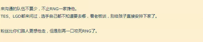 RNG和LNG确实谈得不错,加上夏季赛Uzi回归,圣枪哥冲着Uzi对RNG有较大意向,但还处于考虑当中,原因是春季赛RNG表现不佳,圣枪哥想在自己所剩不多的职业生涯里夺得一次冠军,他怕即使Uzi回归也不能带领RNG打出成绩晋级世界赛。