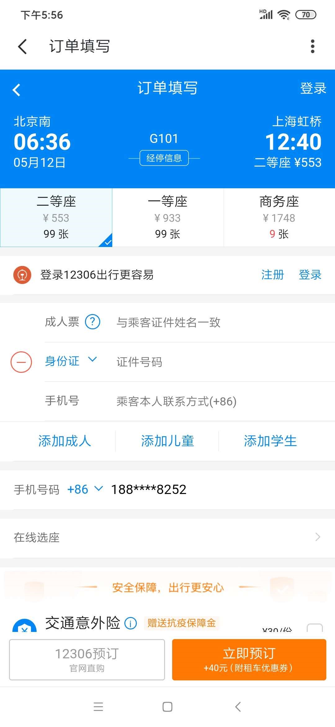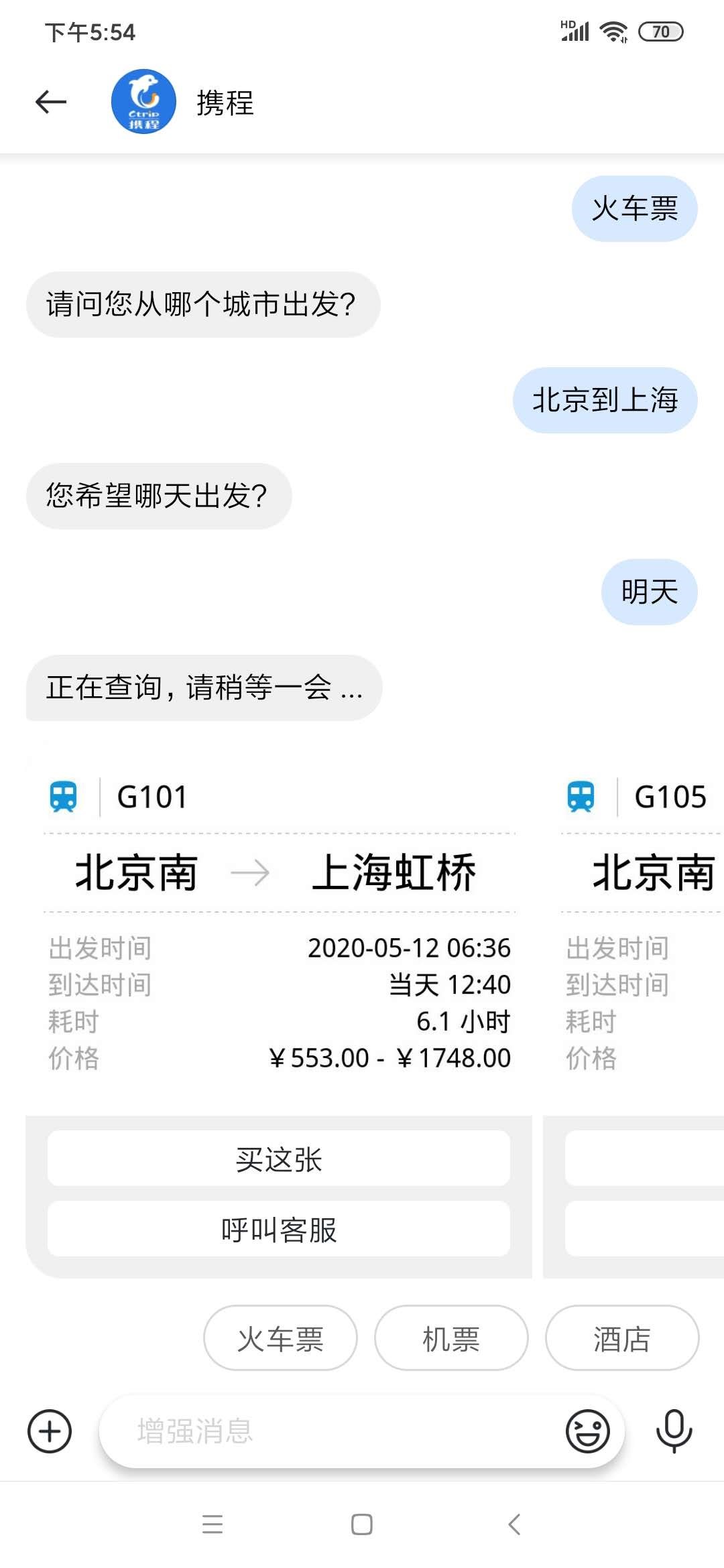 记者随后搜索了曾经在5G消息宣传片中出现的“携程”服务,这一次的智能聊天机器人要“聪明”许多,服务也可以顺利进行。记者输入“火车票”,对方即询问是从哪个城市出发。在回答出发时间问题时,记者特意没有输入具体日期,而是回复了“明天”,对方随即在页面上向记者推送了次日出发的多张火车票。挑选了一张火车票后,记者不需要登录账号,就可以填好乘车人信息并完成座席和座位的选择。随后弹出的支付选项,支持支付宝和微信两种方式,整个过程便捷流畅,用户体验较好。
