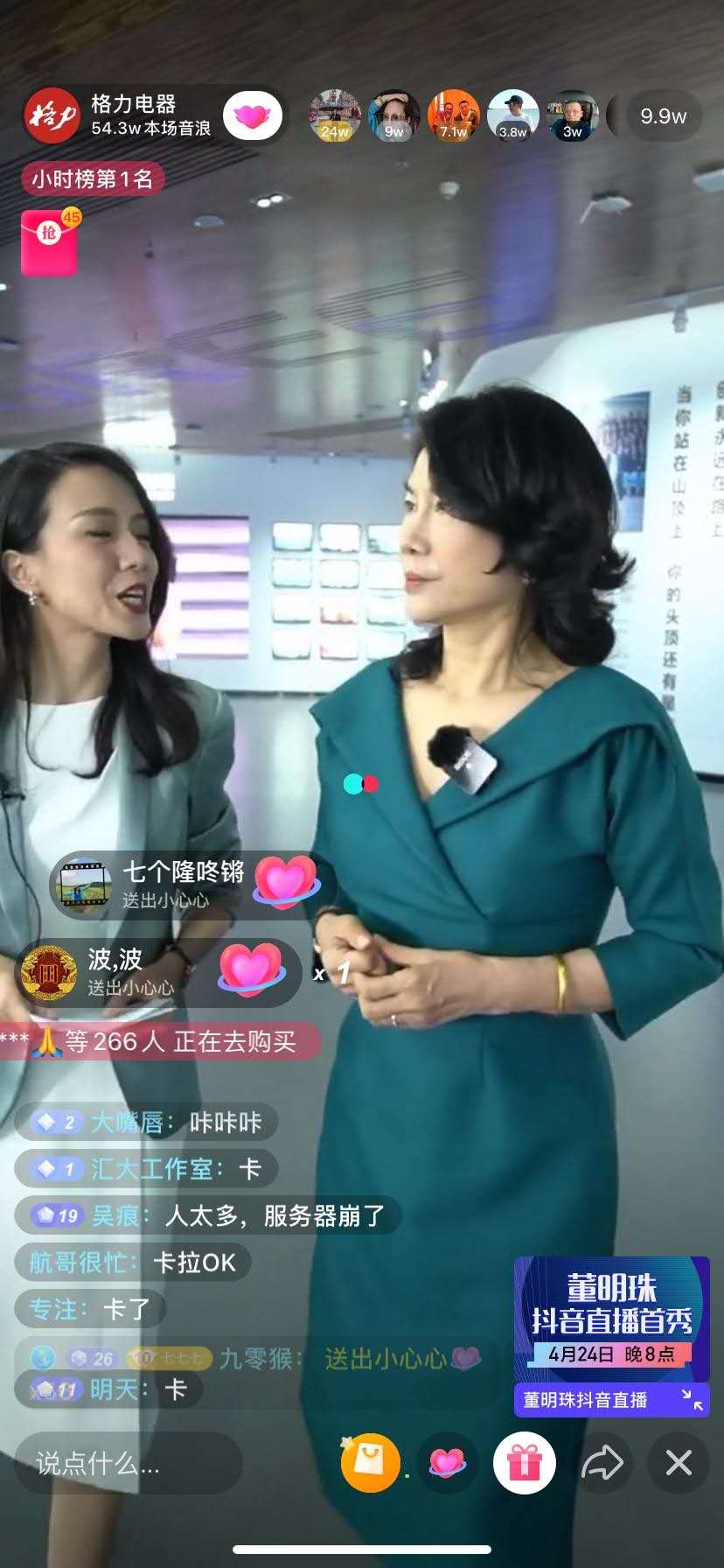 4月24日晚,董明珠在抖音直播间带观众逛格力科技展厅,期间夹杂着对格力各种特色产品的介绍,包括空调、冰箱、家电、中央空调、冠状病毒净化器等。据新抖后台数据显示,当晚商品销售额22.53万元,38件商品的销量为249件,十分惨淡。