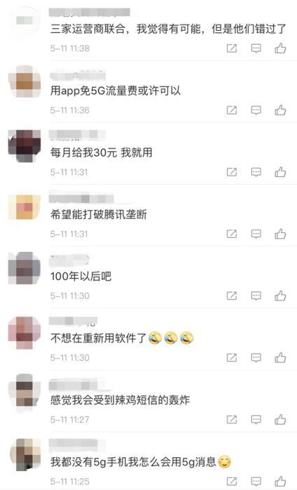 5G消息引发很多人讨论的另一个话题是,“它未来是否可匹敌、甚至取代社交霸主微信”。有网友称,三大运营商联合,有可能。还有网友出谋划策,“用APP免5G流量费或许可以。”