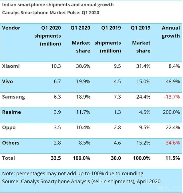 别以为这只是印度的事哦,其实,印度手机市场销售归零,杀伤的却是中国手机厂家,要知道,在印度销量前五的厂商中,有四个中国厂家,占据了73%的市场份额。而且,印度已经是除中国之外的第二大手机市场。小米在印度Q1的销量,达到1000万,甚至超过国内的销量。而vivo和OPPO,也有六七百万的销量。这会让遭受疫情冲击的米OV再受二次打击。