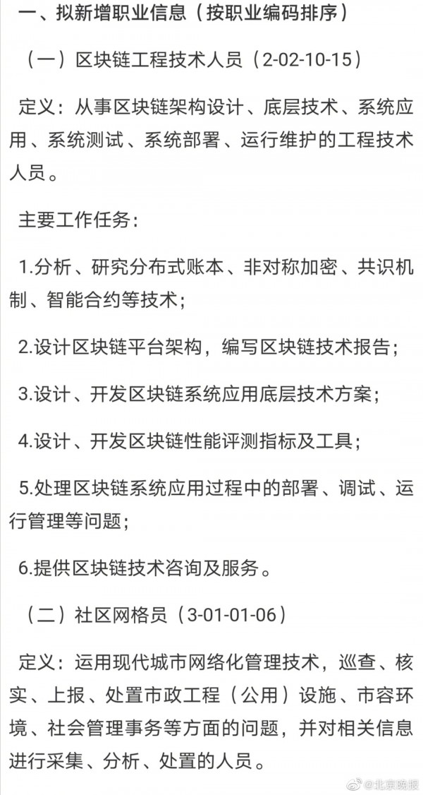 受人社部委托,中国就业培训技术指导中心昨天发文,拟新增区块链工程技术人员、社区网格员、互联网营销师、信息安全测试员、核酸检测员、老年健康评估师等10个新职业。