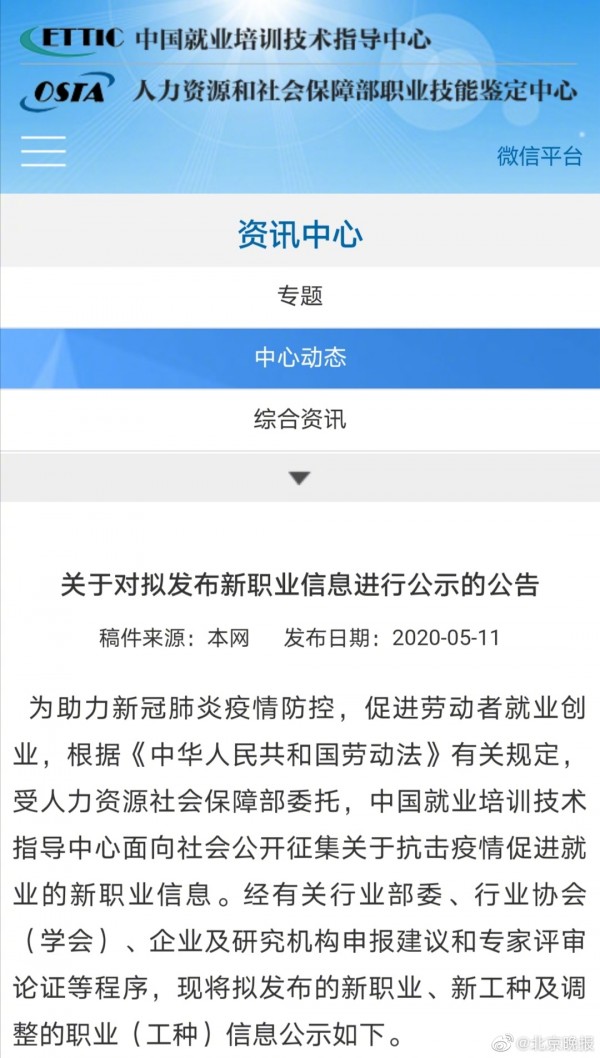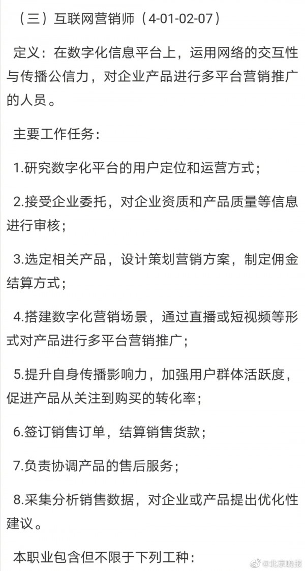 原标题:人社部拟发布10个新职业,人社部拟新增直播销售员工种
