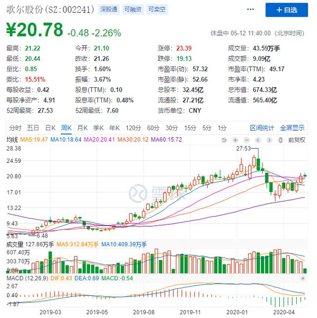近日,歌尔股份2019年的年报和2020年一季报成绩尤为亮眼。数据显示,公司2019年营收、归母净利润双双增长近50%,2020年一季度归母净利润同样增长近50%。