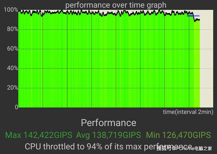 随后,我们使用CPU Throttling Test进行了CPU拷机,看一看OPPO A52的极限算力表现。在15分钟的测试过程中,骁龙665移动平台的CPU可以发挥出至少94%的算力,并冲到了最高的2.01GHz主频。