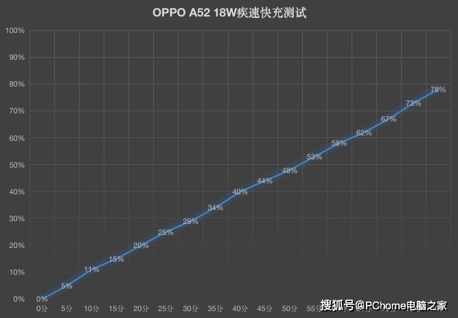 我们将OPPO A52的电量放光,进行充电测试,1小时充电58%。这个成绩乍一看比较一般,但乘以5000mAh就是2900mAh。要知道,一般的安卓手机也就是3000-3500mAh的电池容量。这个成绩基本与18W充电功率吻合,而且在充电过程中几乎感受不到明显发热。
