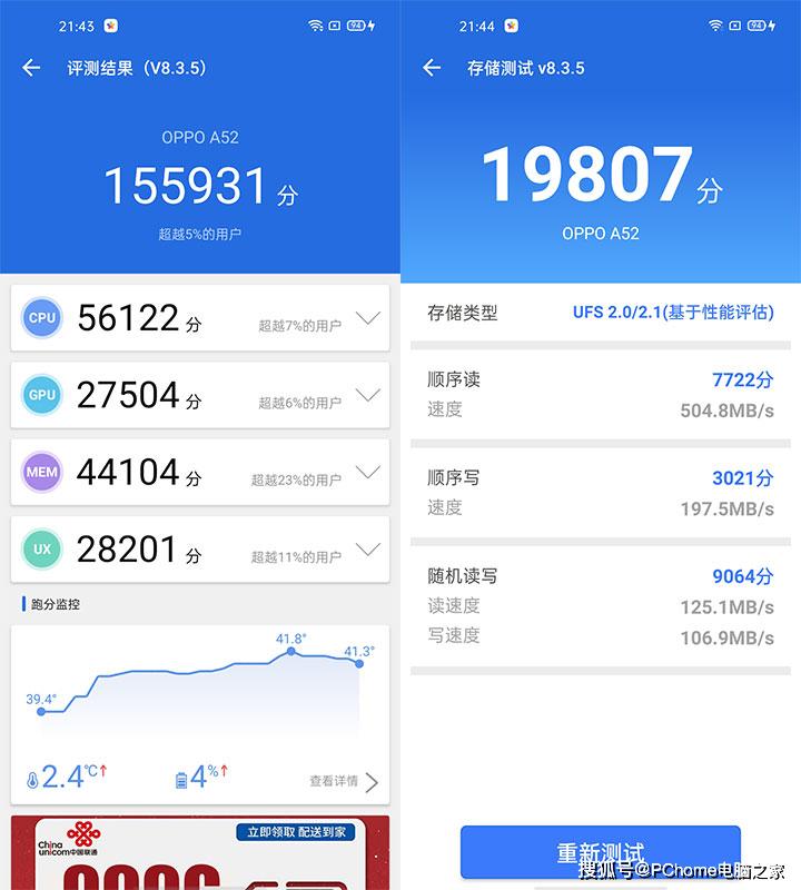 现在,我们就对OPPO A52的性能进行实测,先走一波跑分测试。我们使用安兔兔进行综合跑分和存储测试。综合跑分方面,OPPO A52得分155931分,UX单项得分28201分。存储测试方面,OPPO A52测出的顺序读写速度分别为504.8MB/s和197.5MB/s,随机读写速度分别为125.1MB/s和106.9MB/s。