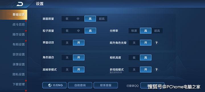 我们将王者荣耀所有特效调至最高并开启界面动效、局外角色光晕、角色描边、多线程模式与高帧率模式。