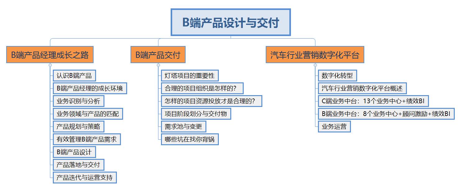 除了《B端产品经理成长之路》专题内容外,还推出了《汽车行业营销数字化平台》、《B端产品交付》2个专题,按照产品+交付+行业案例的方式,全面呈现一个行业产品从业务到产品、从设计到交付运营的全过程,预计超过80篇文章。高单价产品的有汽车、房产、医美、教育、装修等行业,产品、运营有很多类似,可参考。