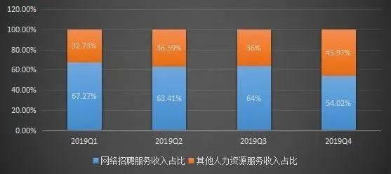 在最近几年中,前程无忧的营收构成中网络招聘的收入占总营收的比重逐步降低,2019年其网络招聘收入在总营收中的比重从67.27%下降到了第四季度的54.02%;而其他人力资源服务收入占比则从此前的32.73%上升到了45.97%。