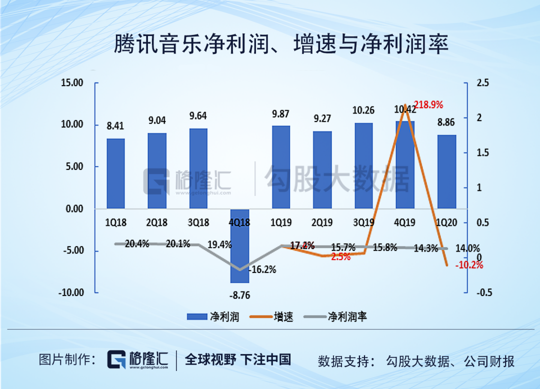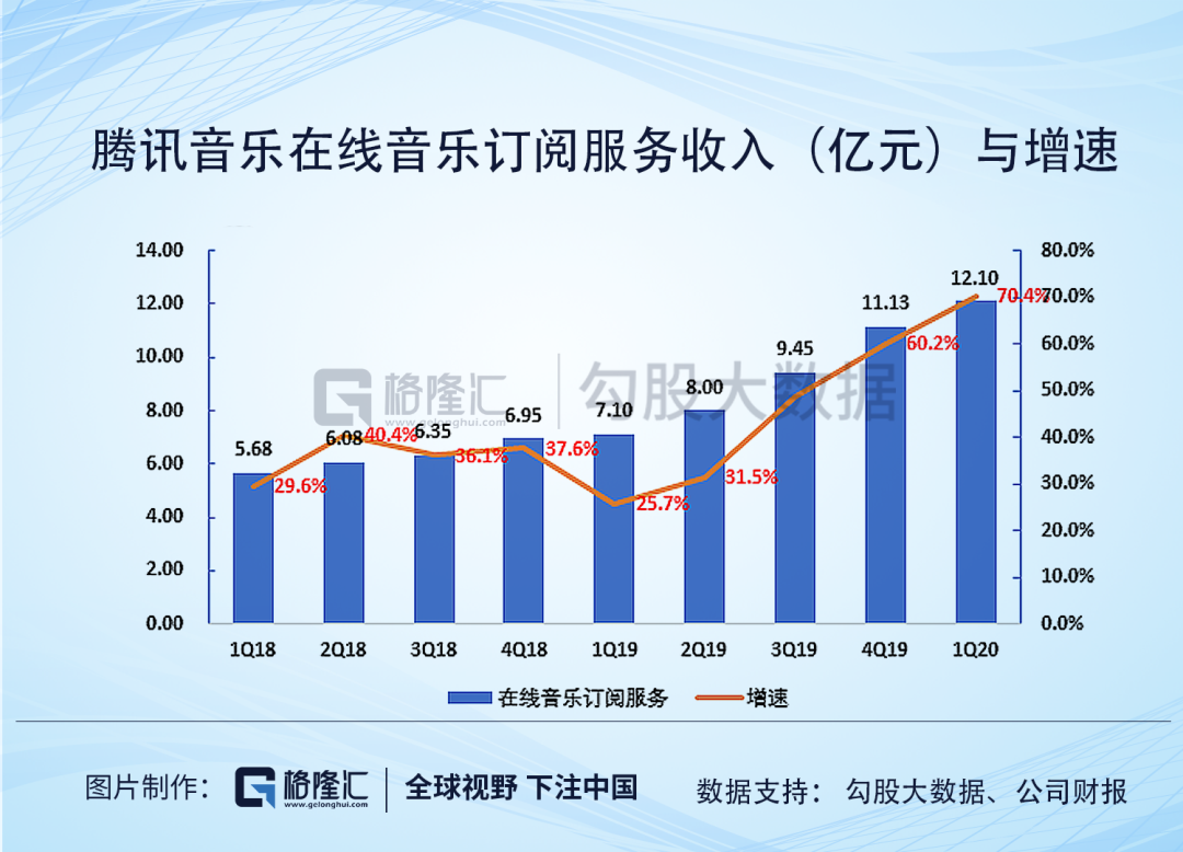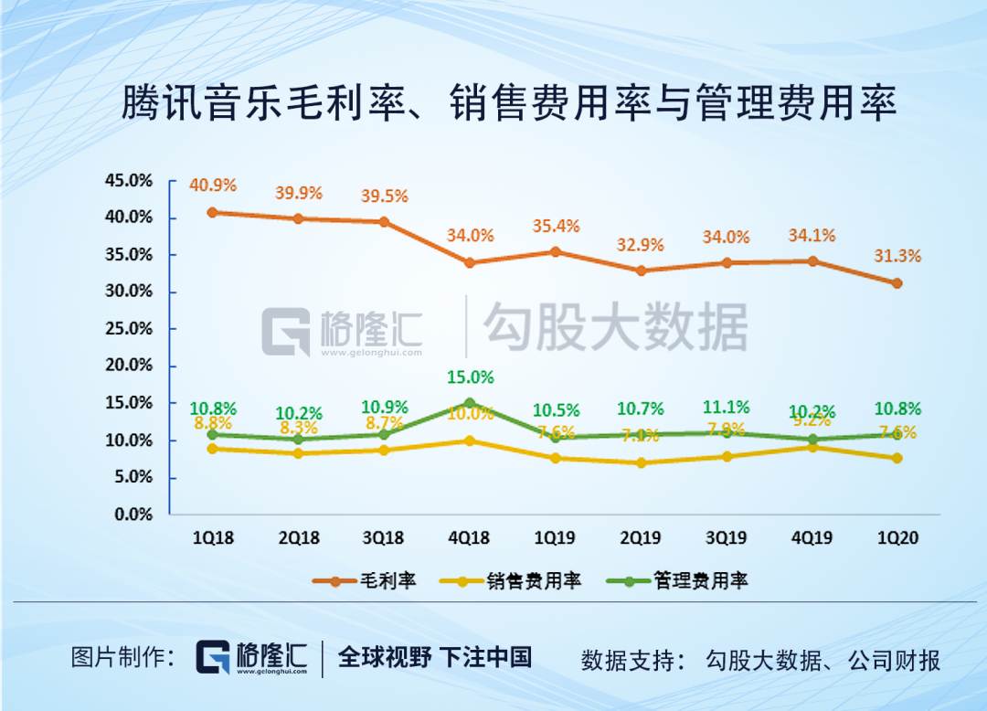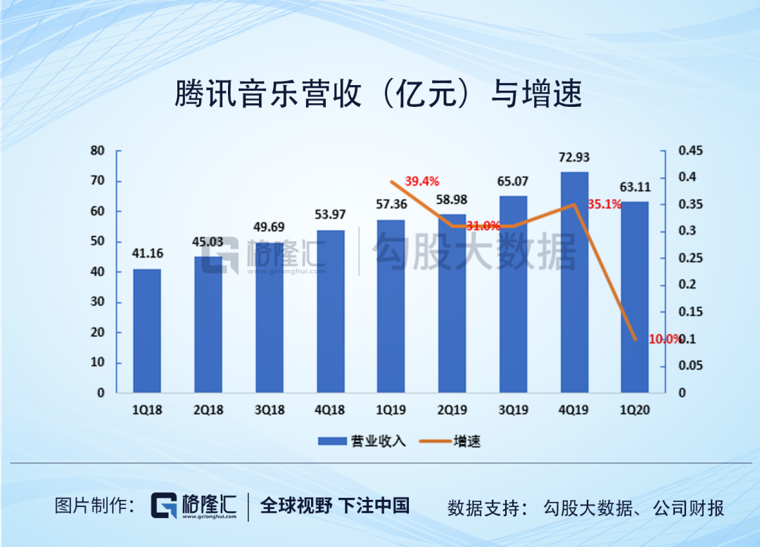 根据财报,腾讯音乐2020Q1实现营收63.11亿元,同比增长10.0%,营收增速较前几个季度有明显下滑。