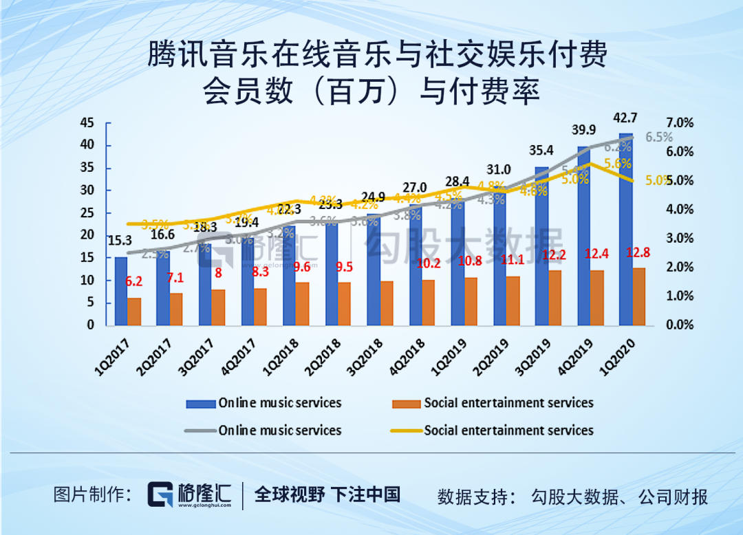 2020Q1腾讯音乐付费会员数亦录得较大增幅,其在线音乐付费会员总数达4270万,同比大增50.4%,用户的付费率上升至6.5%。而社交娱乐付费会员总数为1280万,同比增长18.5%。