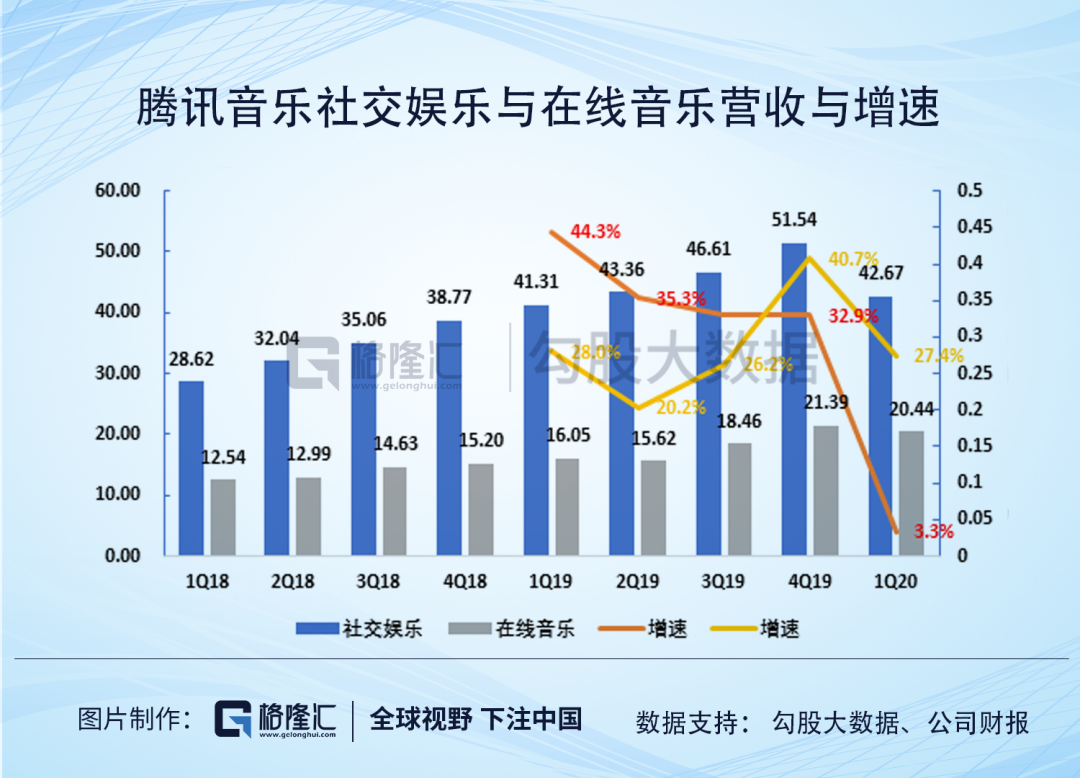 腾讯音乐收入在财报中拆分为在线音乐、社交娱乐与其他收入,其中,在线音乐收入20.44亿元,同比增27.4%,而社交娱乐收入则为42.67亿元,同比微增3.3%。