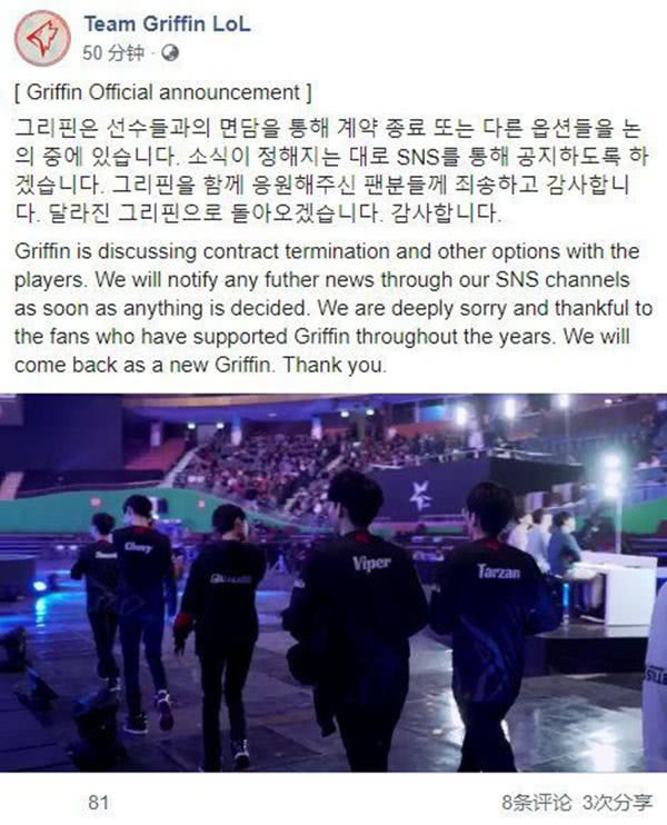 而在日前,GRF官方发声,表示他们正在与选手们沟通合同终止或者其他方面的选择,一旦有任何的决定,都会第一时间在社交平台公布出来。最后GRF官方感到抱歉,并且谢谢这么多年来一直支持他们的观众和粉丝,同时也希望队员们都能拥有好的前途。