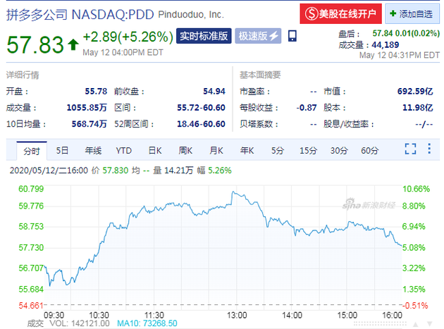 北京时间5月13日凌晨日消息,周二收盘,拼多多股价大涨5.26%,报57.83美元,市值达到692.59亿美元,市值超京东,再创新高。