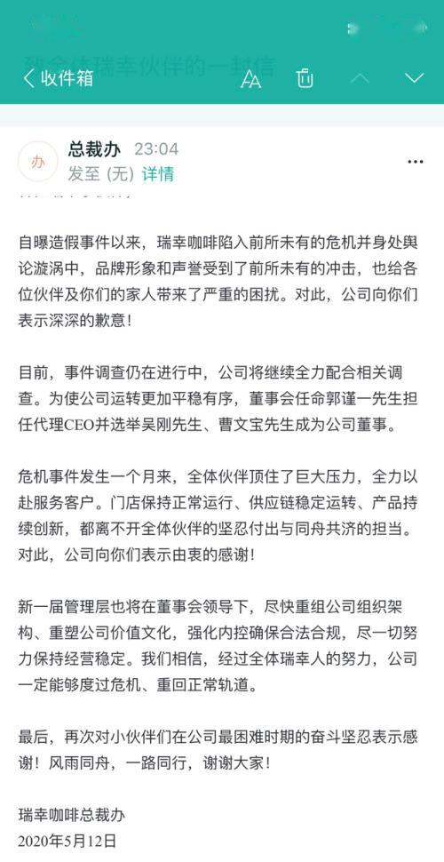 自曝造假事件以来,瑞幸咖啡陷入前所未有的危机并身处舆论漩涡中,品牌形象和声誉受到了前所未有的冲击,也给各位伙伴及你们的家人带来了严重的困扰。对此,公司向你们表示深深的歉意!