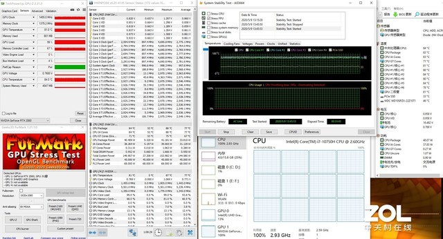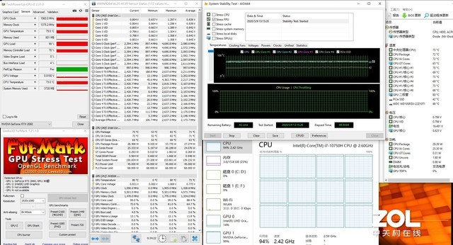 其次是双烤测试。同样是性能模式,AIDA64设置依旧不变,增加Furmark,设置为1080P、8× MSAA。30分钟后,i7-10750H的全核频率稳定在2.4GHz左右,功耗稳定在28W左右,核心温度保持73°;RTX2060的核心频率保持在1560MHz、显存频率1375MHz、核心温度79°。