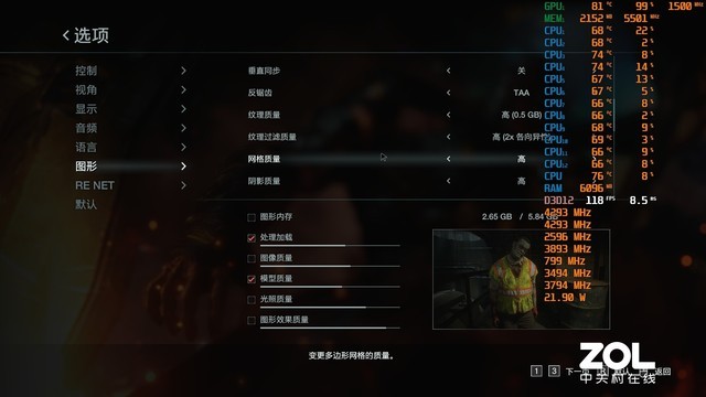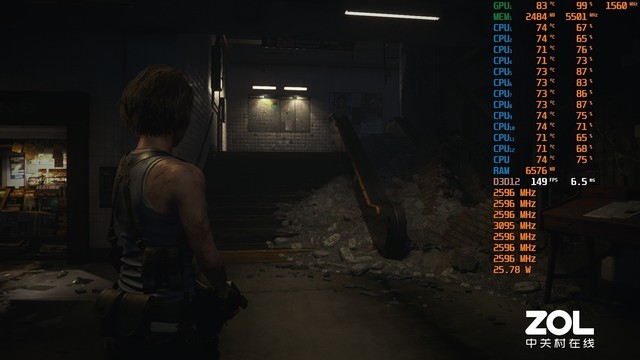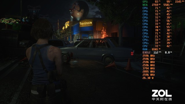 《生化危机3重制版》(试玩Demo)的画质为:DX12、1080P、关闭垂直同步、反锯齿选择TAA、高画质。测试场景为吉尔离开车厢后来到需要灭火的小巷。测试过程中开启监测软件,对游戏表现有一定影响。