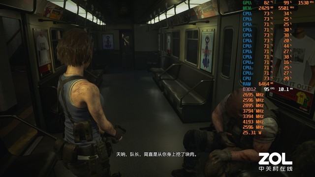 帧数波动方面,从曲线上可以看出,运行《生化危机3重制版》(试玩Demo)的帧数保持在100-140帧之间,多数情况在120帧左右。帧数曲线比较稳定,运行相当流畅。硬件占用方面,《生化危机3重制版》(试玩Demo)在多核心利用方面比较出色,每个核心都有占用,其中有四五个核心频率稳定在2.6GHz,有一两个核心频率稳定在3.5GHz,每个核心的占用率并不高;显卡占用比较稳定,频率保持1530MHz,占用率99%,温度一直保持在83°。