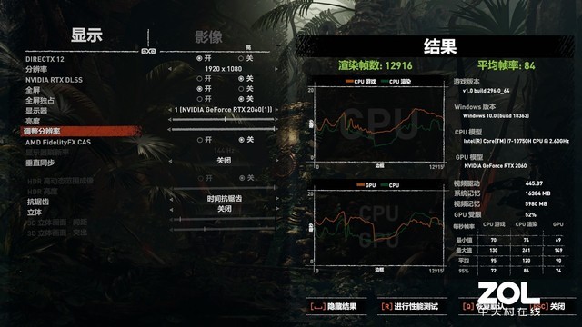 《古墓丽影:暗影》的画质设置为:DX12、1080P、关闭垂直同步、时间抗锯齿、高画质,最终得到平均84帧的成绩,游戏体验相当好。