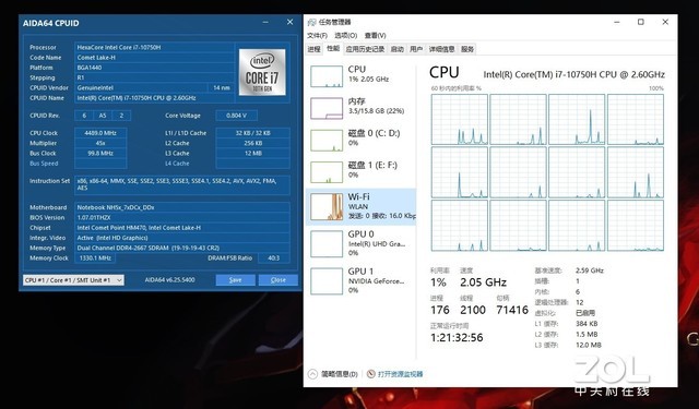 当切换到娱乐模式时,30分钟后,i7-10750H的全核频率稳定在2.9GHz左右,功耗稳定在40W左右,核心温度保持84°;RTX2060的核心频率保持在1455MHz、显存频率1375MHz、核心温度81°。