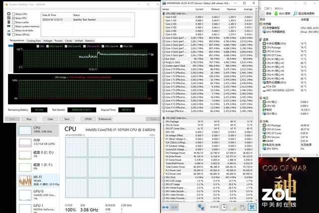 接下来进行单双烤测试。首先是CPU单烤测试,测试软件为AIDA64,勾选Stress FPU,并切换至性能模式。10分钟后,i7-10750H的全核频率稳定在3.0GHz左右,功耗稳定在45W左右,核心温度一直在74°。从单烤测试来看,神舟战神G8-CU7NK的处理器性能释放偏保守。