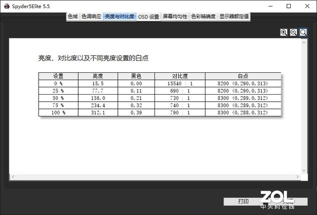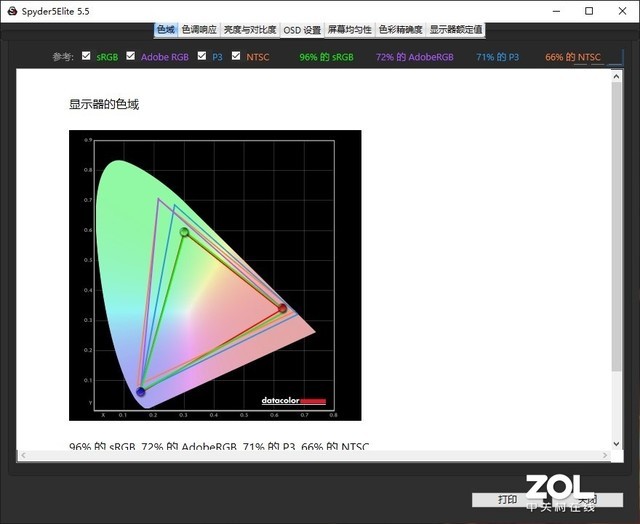 针对这块屏幕,我也进行了测试。使用Spyder 5 Elite对其进行测试,最终得到色域值为96% sRGB、72% AdobeRGB、71% P3、66% NTSC,最高亮度312cd/m2,平均ΔE=0.9。需要说明一点,Spyder 5 Elite在测试2019年以后的笔记本屏幕时,色域值会偏低,而使用Spyder X Elite则正常,所以这里测得96% sRGB,实际色域值要更高。
