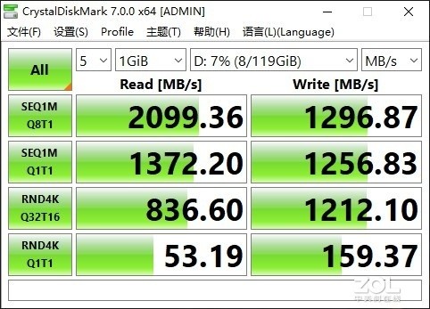 值得一提的是,神舟战神G8-CU7NK采用了16GB DDR4-2666,容量足够,而且还是双通道,速度更快。此外其还采用了256GB PCIe SSD+1TB HDD双硬盘组合,容量充足。实测固态硬盘的速度为:在队列数为8、线程为1时,持续读取为2099MB/s、持续写入为1296MB/s;在队列数为1、线程为1时,4K随机读取为53.19MB/s、4K随机写入为159.37MB/s。从测试结果来看,这块固态硬盘的性能处于PCIe SSD的中等水平。