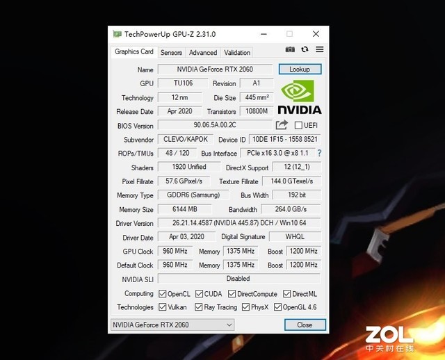 RTX 2060基于图灵架构,拥有1920个CUDA、6GB GDDR6显存、显存位宽192bit,基础频率1005MHz、Boost频率1350MHz,显存频率为1375MHz。