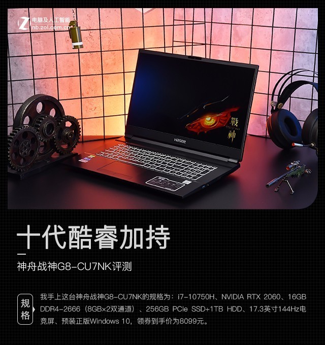 我手上这台神舟战神G8-CU7NK的规格为:i7-10750H、RTX 2060、16GB DDR4-2666(8GB×2双通道)、256GB PCIe SSD+1TB HDD、17.3英寸144Hz电竞屏、预装正版Windows 10,领券到手价为8099元。