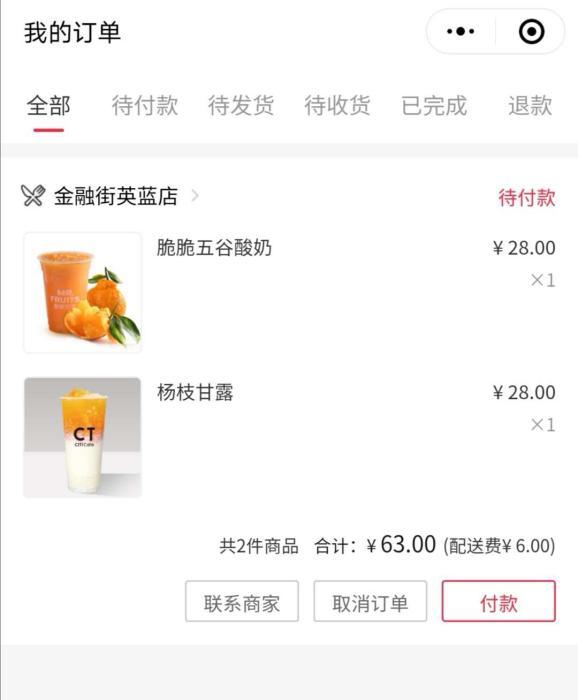 5月11日,“丰食”上北京一家饮品店的外卖订单截图。