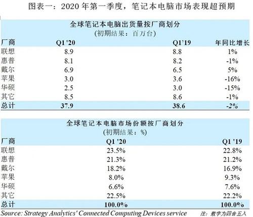 此前,Strategy Analytics高级研究分析师Chirag Upadhyay表示:“在全球范围内,那些严重依赖中国供应链的厂商以及在疫情前库存不大的笔记本电脑厂商在第一季度面临了更大的挑战。从消费者需求的角度来看,最依赖中国国内市场的厂商经历了最大的下滑。除此之外,2020年第一季度全球笔记本电脑出货量同比仅下降了2%,与大多数其它消费类电子产品相比,这被认为是在非常艰难的环境中取得的成功。”