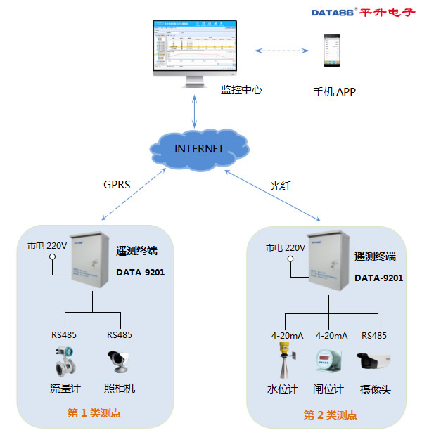生态流量监测终端DATA-9201,实时采集泄水口的测量仪表数据,直读流量计或通过水位折算流量,并远传至监管中心。
