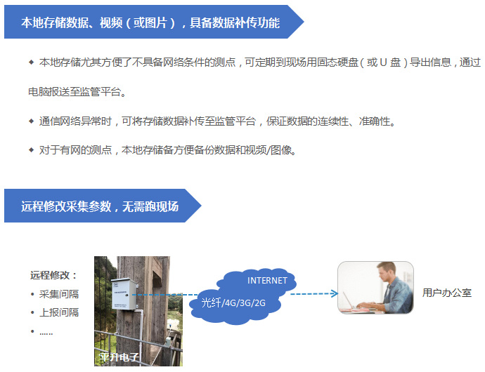 ◆ 光纤/4G:可传输视频和数据 ◆ 3G/2G:可传输数据和照片 ◆ NB-IoT:只传输数据