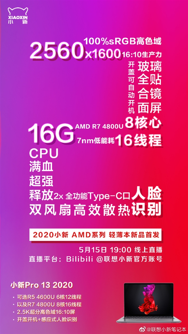 5月15日19:00,在联想小新B站直播间,2020小新AMD系列轻薄新品将正式首发,其中包括小新Pro 13 2020 AMD版,最高配8核16线程的R7 4800U。
